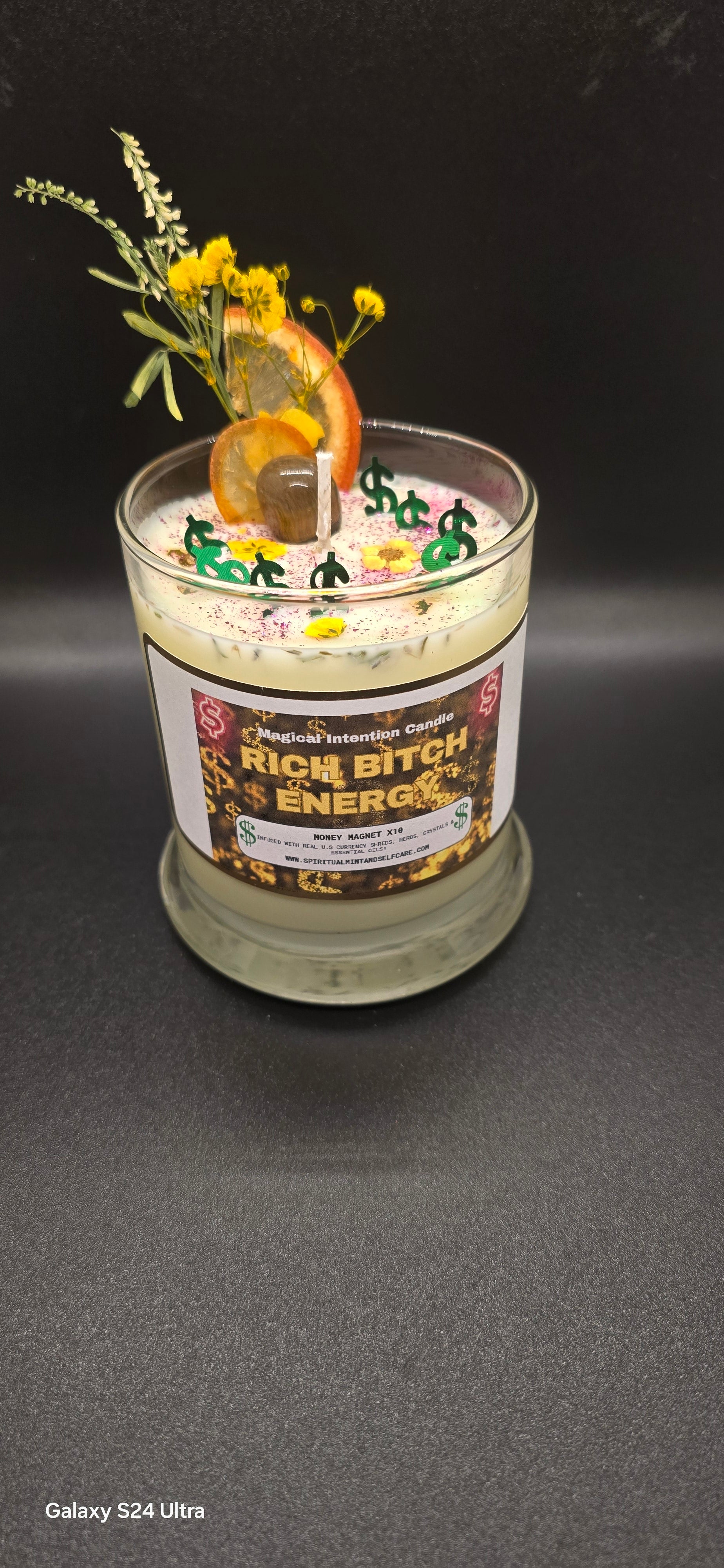 "Unlock your inner Wealth Goddess with Rich B*tch Energy! This intention candle is infused with real U.S currency shreds, herbs, crystals, and essential oils, providing an extra boost to manifesting money with speed. Light it 5x a week for 2 hours and watch the ideas, people, and sales roll in!"